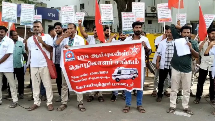 கோவையில் நடைபெற்ற இந்த ஆர்ப்பாட்டத்தில் சுமார் நூற்றுக்கும் மேற்பட்ட 108 ஆம்புலன்ஸ் ஊழியர்கள் கண்டன பதாகைகளை ஏந்தி முழக்கங்களை எழுப்பினர்.