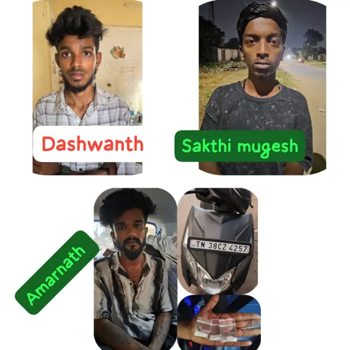 அவர்களிடம் நடத்திய சோதனையில் போதைப் பொருளான ஏழு கிராம் மெத்தாபேட்டமைன், குஷ் என்னும் உயர்ரக கஞ்சா இருப்பது தெரியவந்தது. அவர்களிடம் விசாரித்த போது கணபதியைச் சேர்ந்த அமர்நாத், மணிகாரம்பாளையத்தைச் சேர்ந்த கதிர்வேல், சக்தி முகேஷ், கோவில்மேட்டை சேர்ந்த தஷ்வந்த் என தெரிய வந்தது.