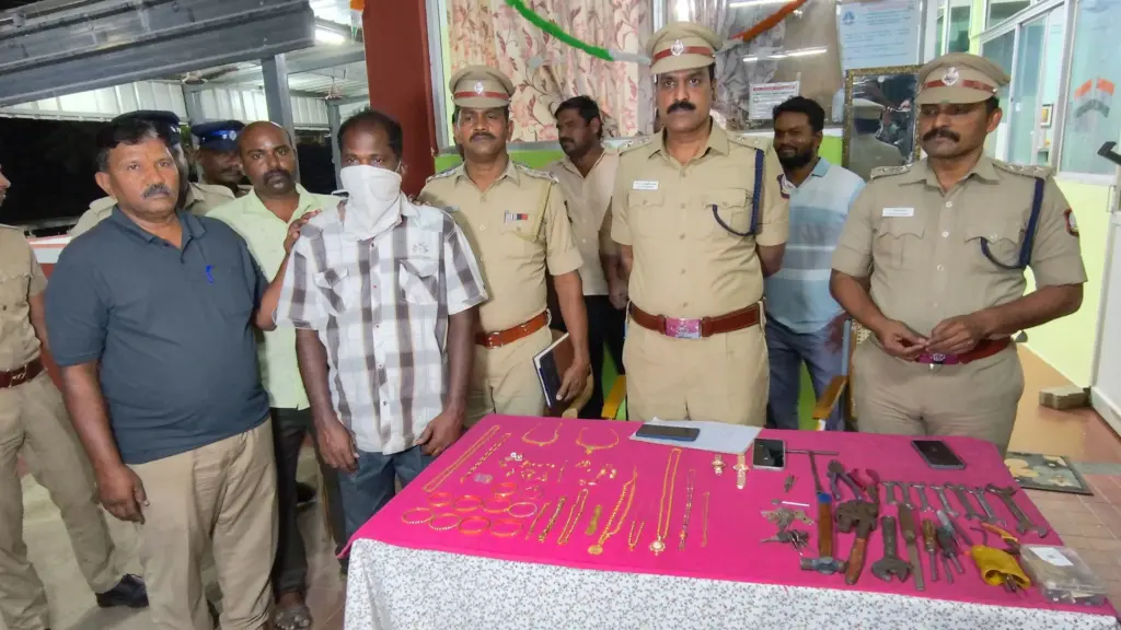 தொடர்ந்து இது குறித்து விசாரணை மேற்கொள்ளப்பட்டதில் கண்ணப்ப நகர் பகுதியில் வசித்து வரும் கிருஷ்ணமூர்த்தி (48) என்பவரை கைது செய்தனர். மேலும் அவரது வீட்டில் இருந்த 80 பவுன் நகைகள் மீட்கப்பட்டு கொத்து சாவிகள், ரம்பம், குரடு, ராடு போன்ற பல்வேறு பொருட்களும் பறிமுதல் செய்யப்பட்டுள்ளது.