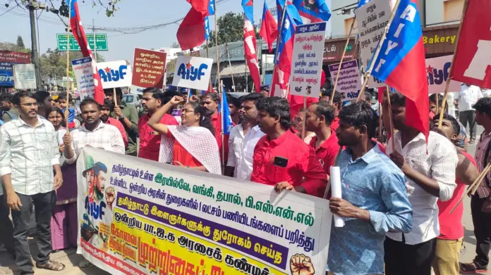 தமிழ்நாட்டில் உள்ள ரயில்வே, வங்கி, தபால், பிஎஸ்என்எல் உள்ளிட்ட ஒன்றிய அரசு துறைகளில் 1 லட்சம் பணியிடங்களை பறித்ததாக கூறி மத்திய அரசை கண்டித்து, அனைத்திந்திய இளைஞர் பெருமன்றம் சார்பில் இன்று மாநிலம் தழுவிய போராட்டம் நடைபெற்றது.