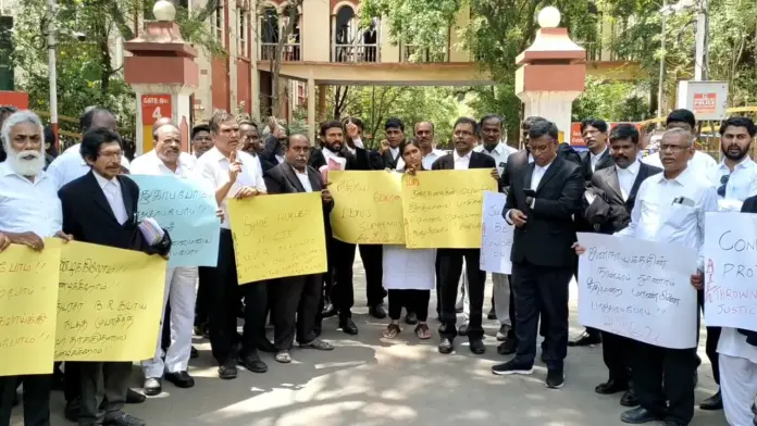 கோவை: உச்சநீதிமன்ற நீதிபதி மீது காலணி வீச முயன்ற வழக்கறிஞரை கண்டித்து கோவையில் வழக்கறிஞர்கள் ஆர்ப்பாட்டம் மேற்கொண்டனர்.