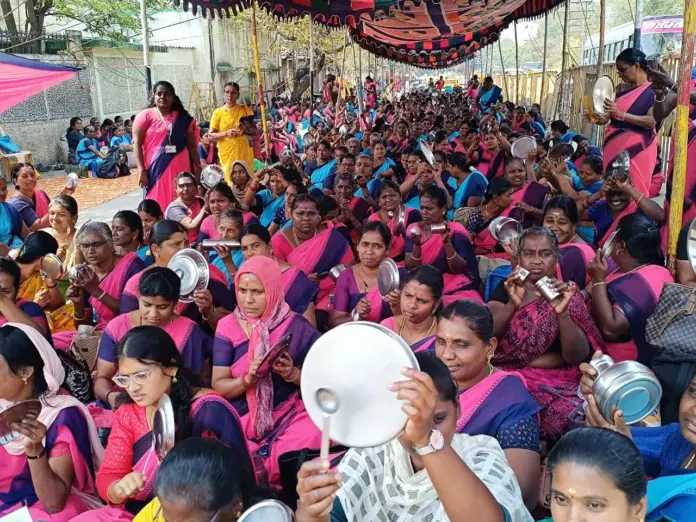 பல்வேறு கோரிக்கைகளை வலியுறுத்தி சத்துணவு அங்கன்வாடி ஊழியர்கள் தொடர் போராட்டத்தில் ஈடுபட்டு வரும் நிலையில் 15வது நாளான இன்று காலி தட்டுகளையும் டிபன் பாக்ஸ்களை தட்டி போராட்டத்தை நடத்தி வருகின்றனர். கோவையில் தெற்கு வட்டாட்சியர் அலுவலகம் அருகில் நாள்தோறும் இரவு முழுவதும் அங்கேயே படுத்து உறங்கி போராட்டத்தை தொடர்ந்து நடத்தி வருகின்றனர்.
