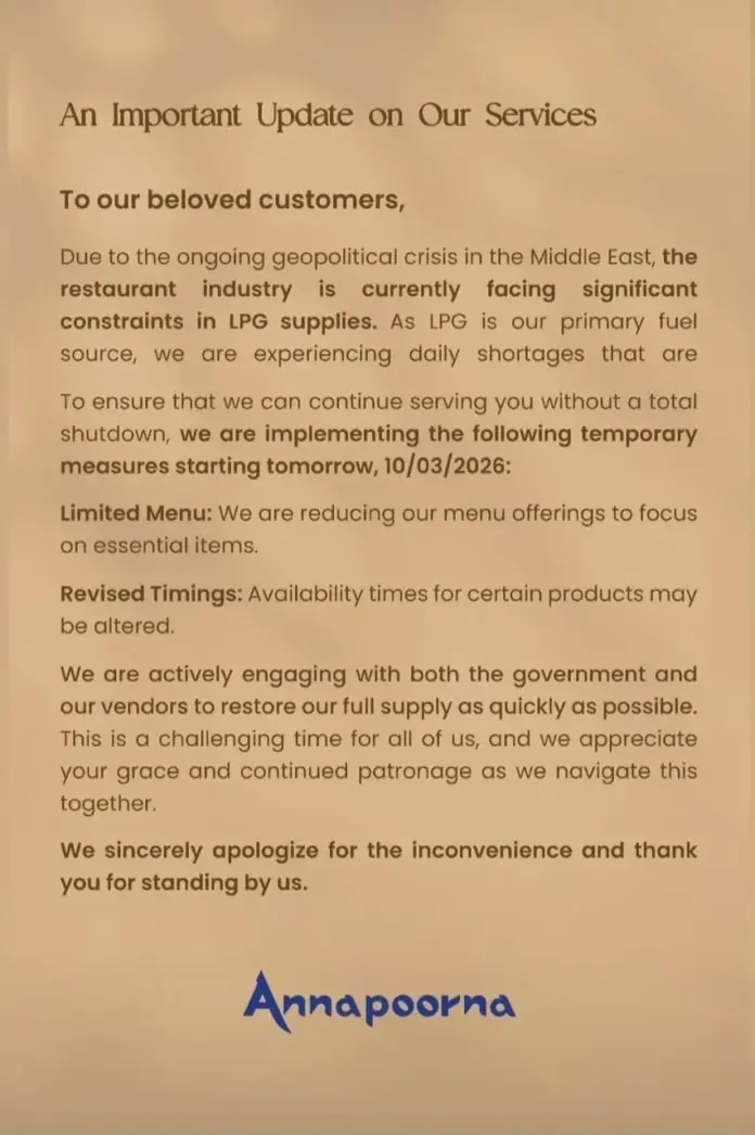 தற்போது நிலவி வரும் கேஸ் சிலிண்டர் விலை உயர்வு மற்றும் தட்டுபாடு காரணமாக கோவையில் அன்னபூர்ணா உணவகம் இன்று (10.03.2026) முதல் உணவு மெனு பட்டியலை குறைப்பதாக தெரிவித்துள்ளது.