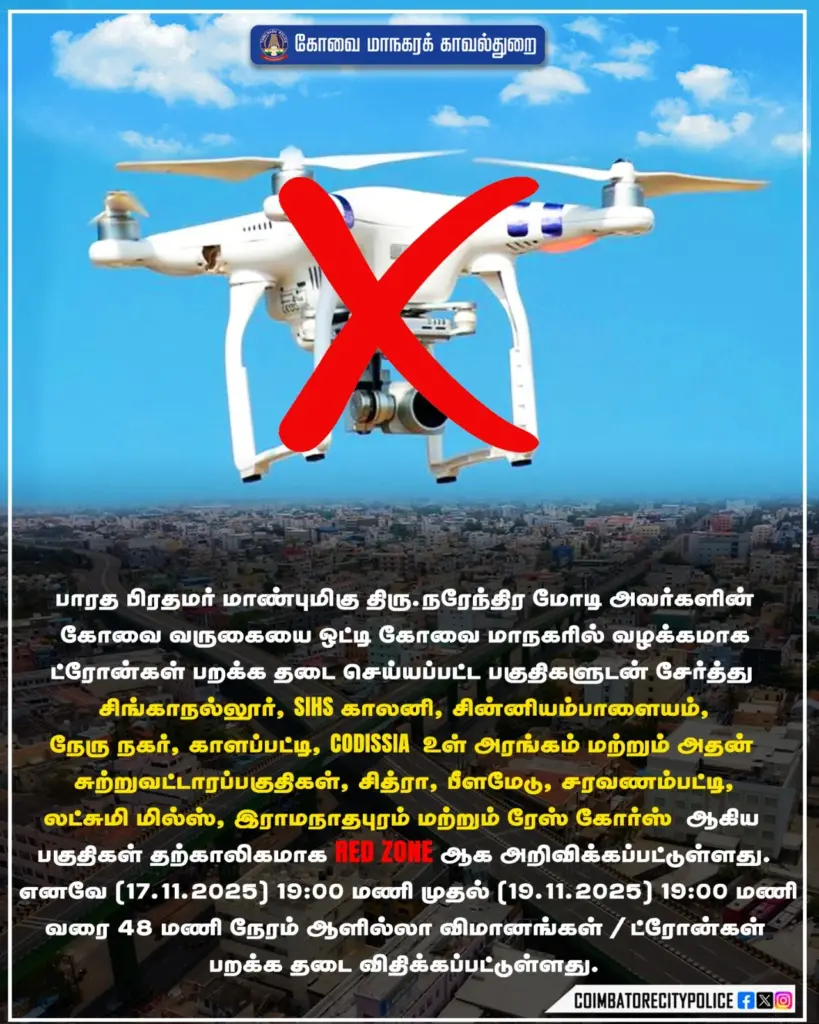 பிரதமர் வருகையை முன்னிட்டு கோவையில் RED ZONE ஆக அறிவிக்கப்பட்ட பகுதிகள்- ட்ரோன்கள் பறக்க தடை…