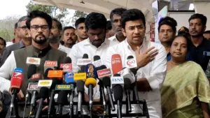 இதை தொடர்ந்து பேசிய அனுராக் தாகூர், விஜய் பங்கேற்ற பிரச்சார நிகழ்ச்சிக்கு அனுமதி கொடுத்தது யார் என்றும் போலீசார் எத்தனை பேர் பாதுகாப்பு பணியில் ஈடுபட்டார்கள் எத்தனை பேர் காரில் இருந்தார்கள் என்பதெல்லாம் கேள்விக்குறியாக இருப்பதாகவும் சமூக வலைதளங்களில் பேசுபவர்களின் குரல்களை இந்த அரசு நசுக்குகிறது என்றும் குற்றம் சாட்டினார்.