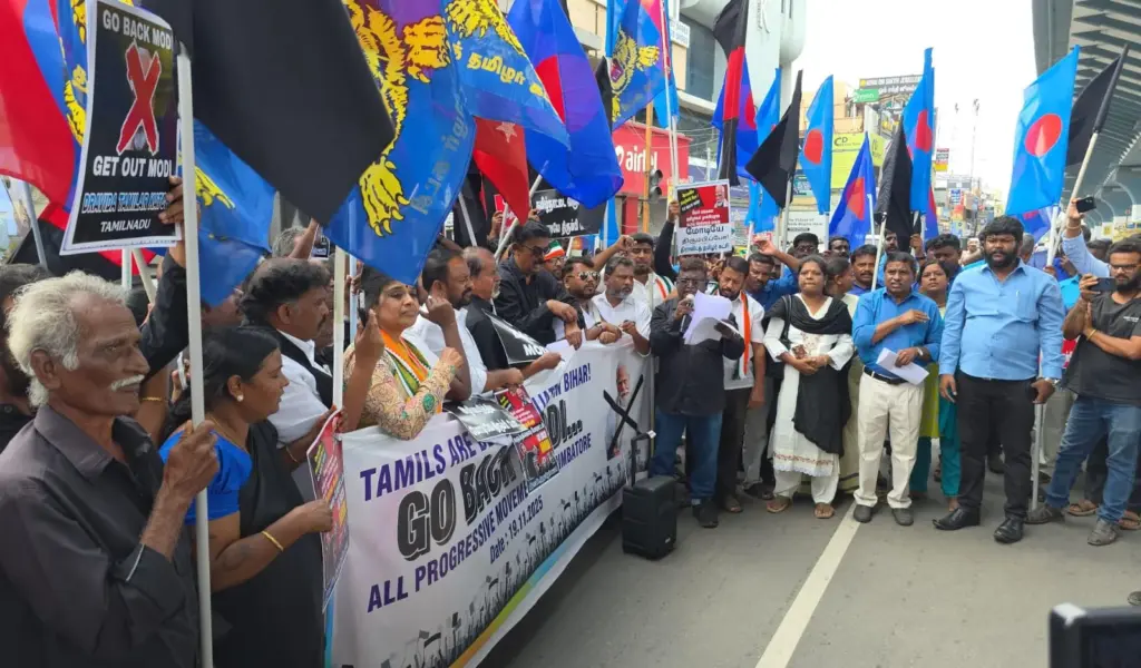 கோவை: Go Back MODI என்ற முழக்கத்துடன் கருப்புக்கொடி காண்பித்து அனைத்து முற்போக்கு இயக்கங்கள் சார்பில் பிரதமருக்கு எதிராக ஆர்ப்பாட்டம் நடைபெற்றது.