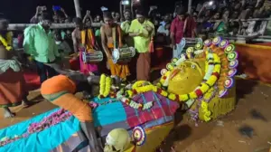 கோவை சொக்கம்புதூர் மயான கொள்ளை நிகழ்ச்சியில் பூசாரி எலும்பை கடித்து வழிபாடு செய்தார்.