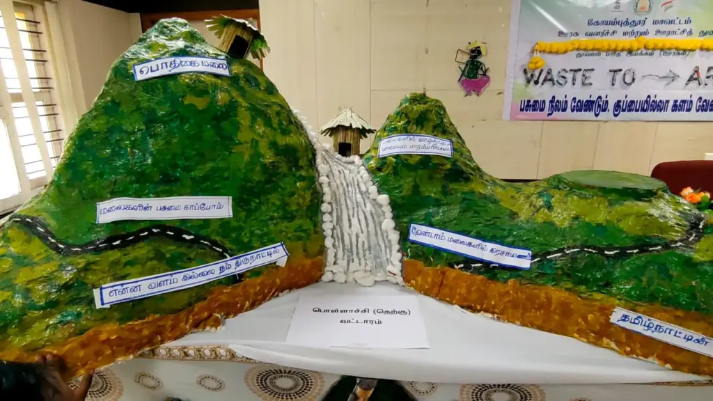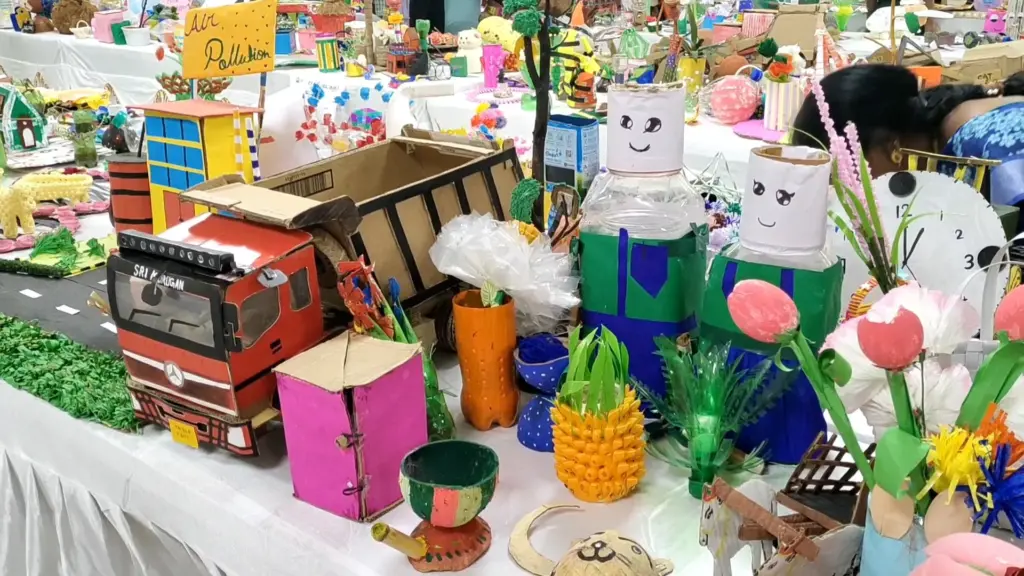 நெகிழி, தேங்காய் சிரட்டை, தெர்மாகோல், அட்டை, குழாய்கள் போன்ற வீட்டில் பயன்படுத்தப்பட்டு தூக்கி எறிய கூடிய பொருட்களை கொண்டு பள்ளி மாணவர்கள் பல்வேறு அலங்கார பொருட்கள், அறிவியல் சார்ந்த பொருகள், நாட்டின் முக்கிய இடங்கள், ராக்கெட்டுகள், மழை நீர் சேமிப்பு மாதிரிகள் ஆகியவற்றை வடிவமைத்திருந்தனர்.