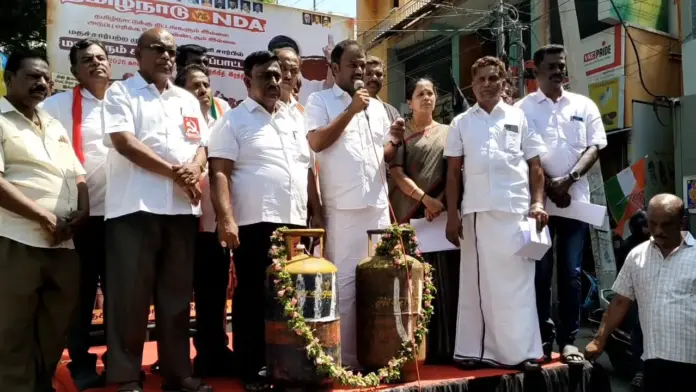 கோவை: வணிக கேஸ் சிலிண்டருக்கு நாமம் போட்டு திமுக மற்றும் கூட்டணி கட்சியினர் ஆர்ப்பாட்டம் மேற்கொண்டனர்.