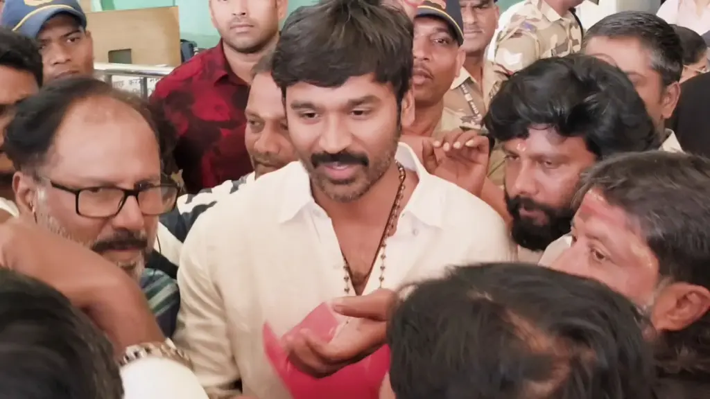 பிறகு காரில் ஏறிய தனுஷ் காரில் இருந்த வண்ணம் ரசிகர்களுக்கு நன்றிகளை தெரிவித்தபடி புறப்பட்டார்.