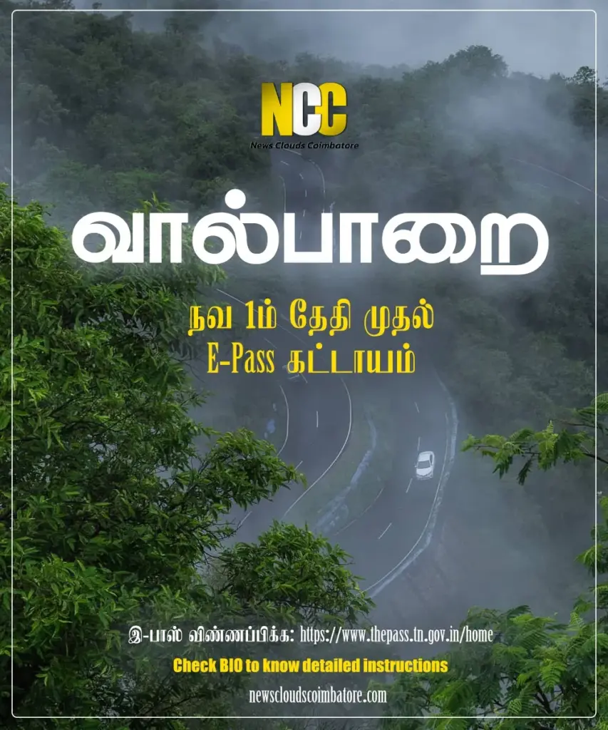 சென்னை உயர் நீதிமன்ற உத்தரவின்படி, கோயம்புத்தூர் மாவட்டம், வால்பாறைக்கு வருகின்ற நவம்பர் 01.11.2025 ஆம் தேதி முதல் இ-பாஸ் நடைமுறை அமல்படுத்தப்படுகிறது. எனவே, நவம்பர் 1 ஆம் தேதியிலிருந்து வால்பாறைக்கு வரும் அனைத்து சுற்றுலாப் பயணிகள் தங்களது வாகனங்களுக்கு இ-பாஸ் பெற்று பயணம் செய்ய வேண்டும்.