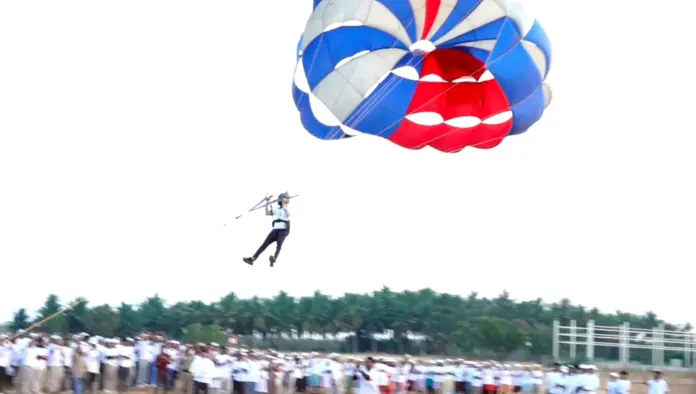 100% வாக்களிப்பதன் அவசியம் குறித்து விழிப்புணர்வு ஏற்படுத்தும் வகையில் ராட்சத பலூனில் பாரா ரைடிங் செய்த கோவை மாவட்ட ஆட்சியர்.