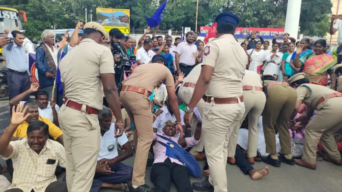 தொடர்ந்து மாவட்ட ஆட்சியர் அலுவலகம் முன்பு சாலை மறியலில் ஈடுபட்ட சுமார் நூற்றுக்கும் மேற்பட்டவர்களை காவல்துறையினர் கைது செய்தனர். இதனால் இப்பகுதியில் சிறிது நேரம் போக்குவரத்து பாதிக்கப்பட்டது.