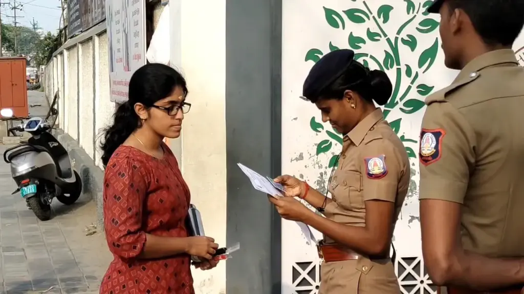 9:30 மணிக்கு தேர்வு தொடங்கும் நிலையில் 9 மணிக்குள் அனைத்து தேர்வாளர்களும் தேர்வு மையத்திற்குள் இருப்பதற்கு அறிவுறுத்தப்பட்டு அதன்படி அனைவரும் 9 மணி வரை தேர்வாளர்கள் அனுமதிக்கப்பட்டனர். மேலும் தேர்வு எழுத வரும் தேர்வாளர்கள் ஸ்மார்ட் வாட்ச் செல்போன் போன்ற மின்னணு சாதனங்கள் எடுத்துச் செல்வதற்கு அனுமதியில்லை என்பதால் காவல்துறையினர் தேர்வாளர்களின் உடமைகளை சோதனை செய்த பிறகே தேர்வு மையத்திற்குள் அனுமதிக்கப்பட்டனர்.