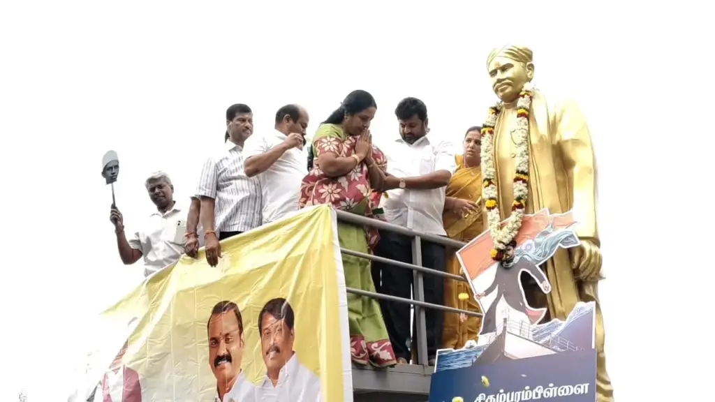 வந்தே மாதரம் பாடலின் 150 வது ஆண்டு கொண்டாட்டத்தின் ஒரு பகுதியாக கோவை வ.உ.சி மைதானத்தில் வந்தே மாதரம் முழு பாடல் இசைக்கும் நிகழ்ச்சி பாஜக சார்பில் நடைபெற்றது. இதில் கலந்து கொண்ட பா.ஜ.க தேசிய மகளிர் அணி தலைவி வானதி சீனிவாசன் எம்.எல்.ஏ சிதம்பரனாரின் சிலைக்கு மலர் தூவி மரியாதை செலுத்தினார்.