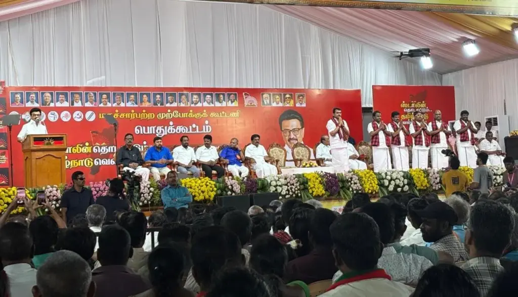 அந்த வகையில் நேற்று மாலை கோயம்புத்தூர், அவிநாசி சாலையில் உள்ள கொடிசியா மைதானத்தில் கோயம்புத்தூர் மாவட்டத்தில் உள்ள சட்டமன்ற தொகுதிகளில் போட்டியிடும் திமுக மற்றும் கூட்டணி கட்சி வேட்பாளர்களை ஆதரித்து நடைபெற்ற பிரச்சார பொதுக்கூட்டத்தில் மு க ஸ்டாலின் கலந்து கொண்டார்.