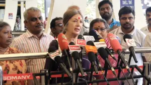 கோவை விமான நிலையத்தில் மேற்கு வங்க முன்னாள் நாடாளுமன்ற உறுப்பினர் (CPIM) பிருந்தா காரத் செய்தியாளர்களை சந்தித்தார்.