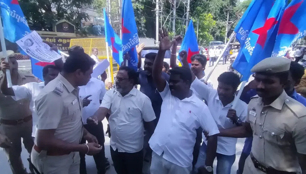மாவட்ட ஆட்சியர் அலுவலகம் முன்பு திரண்ட தமிழ்புலிகள் கட்சியினர் அதிமுக செய்தி தொடர்பாளர் சத்தியன் தாழ்த்தப்பட்ட மக்களை அவதூறாக பேசியதாகவும் அதற்கு அதிமுக பொதுச்செயலாளர் எடப்பாடி பழனிச்சாமி நடவடிக்கை எடுக்கவில்லை என்று கூறி அவரது உருவ பொம்மையையும்