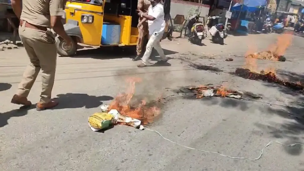 பீகார் தேர்தலில் தமிழக மக்களை கேவலமாக பேசி பிரச்சாரம் மேற்கொள்வதாக பாஜகவினரை கண்டித்து பிரதமர் உருவ பொம்மையையும் எரித்து போராட்டத்தில் ஈடுப்பட்டனர். உடனடியாக அங்கிருந்த போலிசார் அந்த தீயை அணைத்தனர். இதனால் அப்பகுதியில் பெரும் பரபரப்பு ஏற்பட்டது.