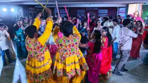 வீடுகளில் கொலு பொம்மை வைத்து வழிபடுகின்றனர். இதனை வரவேற்கும் விதமாக கோவை குஜராத் சமாஜில் பாரம்பரிய நடனமான தாண்டியா நடன நிகழ்ச்சி நடந்தது.