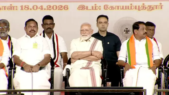 தேசிய ஜனநாயக கூட்டணியின் கோயம்புத்தூர், திருப்பூர் மற்றும் நீலகிரி மாவட்டங்களை சேர்ந்த 21 வேட்பாளர்களை ஆதரித்து, பிரதமர் நரேந்திர மோடி சிறப்பு விருந்தினராக பங்கேற்ற தேர்தல் பொதுக்கூட்டம் கோவை கொடிசியா மைதானத்தில் நடைபெற்றது.