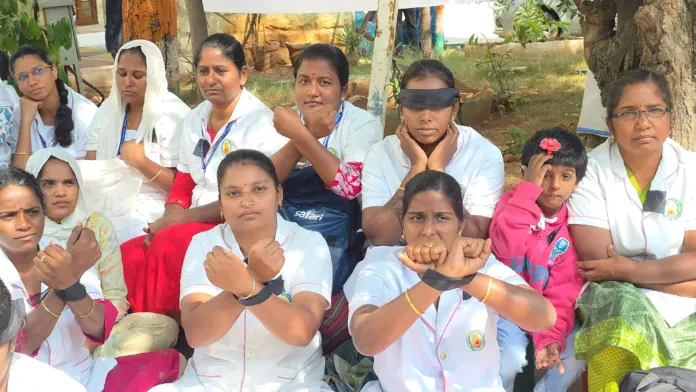 கோவை: கண்கள் மற்றும் கைகளை கட்டி கொண்டு செவிலியர்கள் போராட்டத்தில் ஈடுபட்டு வருகின்றனர்.