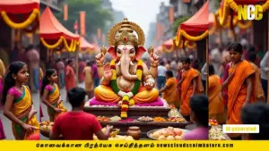 கோவை மாநகரில் விநாயகர் சதுர்த்தி ஊர்வலங்களில் மக்கள் பயணம் செய்ய தடை விதிக்கப்பட்டுள்ள லாரிகள், டெம்போக்கள் மற்றும் வேன்கள் போன்ற பொது சரக்கு வாகனங்கள் பயன்படுத்தப்பட்டு வருகிறது.