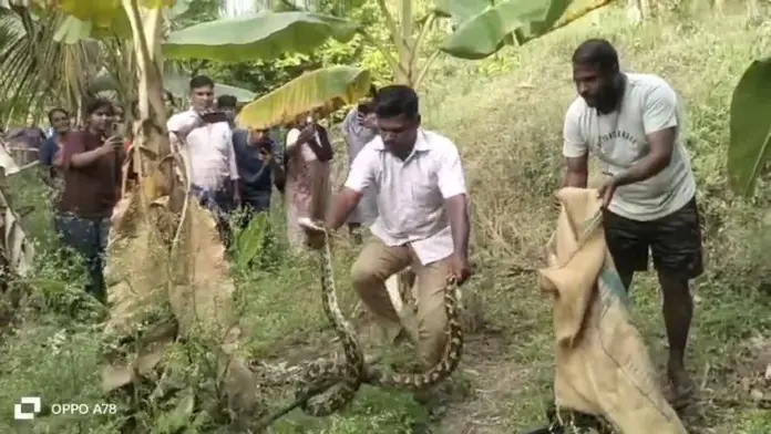 வீட்டில் இருந்த கோழியைத் தனது பிடியில் சிக்க வைத்து, விழுங்குவதற்குத் தயாராக இருந்த அந்தப் பாம்பைக் கண்டு அதிர்ச்சி அடைந்த குடும்பத்தினர், உடனடியாக வனத்துறையினருக்குச் தகவல் தெரிவித்தனர்.
