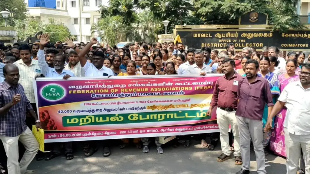 நில அளவைத் துறையில் வெளி முகமை ஒப்பந்த அடிப்படையில் ஆன பணி நியமனங்களை கைவிட வேண்டும், வருவாய் மற்றும் பேரிடர் மேலாண்மை துறையின் அனைத்து காலிப் பணியிடங்களையும் காலமுறை ஊதியத்தில் நிரப்ப வேண்டும், கிராம நிர்வாக அலுவலர்கள் கிராமங்களிலேயே தங்கி பணிபுரிய வேண்டும் என்பதை தளர்த்த வேண்டும் அவர்களின் வட்ட எல்லைக்குள் தங்கி பணிபுரியும் வகையில் விதிகளை திருத்த வேண்டும் உள்ளிட்ட ஒன்பது அம்ச கோரிக்கைகளை வலியுறுத்தி போராட்டம் நடைபெறுகிறது.