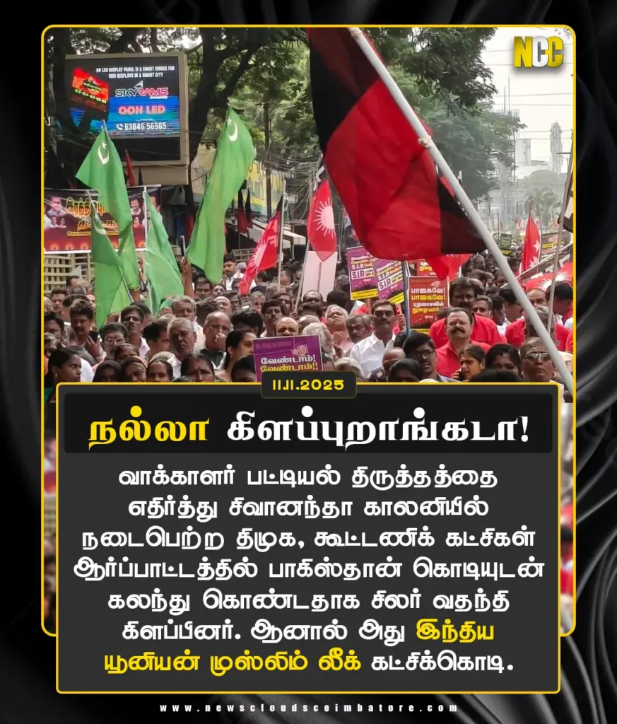 கோவை: கோவையில் நடைபெற்ற திமுக ஆர்ப்பாட்டத்தில் பாகிஸ்தான் கொடி பறந்ததாக சில வதந்தியை கிளப்பியுள்ளனர்.