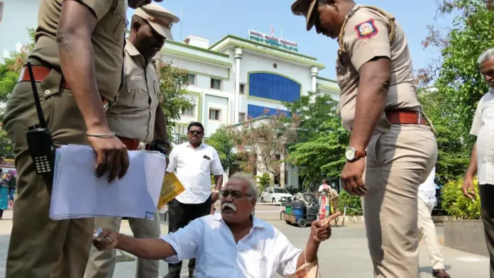 காவல்துறையினர் அவரிடம் சமாதான பேச்சுவார்த்தை நடத்தி மாவட்ட ஆட்சியரிடம் மனு அளிக்கும்படி வலியுறுத்திய பொழுதிலும் அவர் எழுந்திருக்காமல் இருந்ததால் காவல்துறையினர் அவரை வலுக்கட்டாயமாக எழ செய்தனர். இருப்பினும் அவர் வர மறுத்து காவல்துறையிடம் வாக்குவாதத்தில் ஈடுபட்டார்.