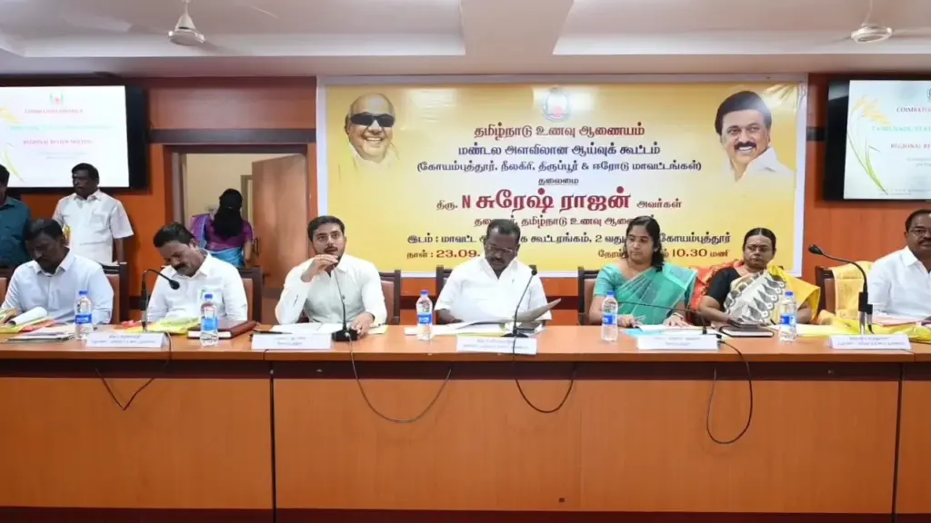 கோவை மாவட்ட ஆட்சியர் அலுவலக கூட்டரங்கில் தமிழ்நாடு உணவு ஆணையம் சார்பில் மண்டல அளவிலான ஆய்வுக் கூட்டம் நடைபெற்றது. ஆணையத்தின் தலைவர் சுரேஷ் ராஜன் தலைமையில் நடைபெற்றது.