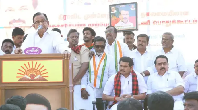 அமித்ஷா தமிழ்நாட்டிற்கு எந்த பாதகமும் வராது என்று கூறியதாக எடப்பாடி பழனிச்சாமி கூறுகிறார், என்று தெரிவித்த சிதம்பரம் இது என்ன அடிமைத்தனம் என்று கேள்வி எழுப்பினார். எடப்பாடி பழனிச்சாமி பொம்மலாட்டத்தில் வரும் பொம்மை போன்று என்றும் அவரை பின்னால் இருந்து நூல் கட்டி இயக்குவது அமித்ஷா என்றும் விமர்சித்தார். நமக்கும் அதிமுகவிற்கும் போட்டி என்பது போன்று தோன்றும் ஆனால் உண்மையில் நமக்கும் பாஜகவிற்கும் தான் போட்டி என்று தெரிவித்தார். வக்பு தீர்த்த சட்ட மசோதாவை பாஜக கொண்டு வந்தது அது தற்பொழுது நீதிமன்றத்தில் இருக்கிறது தற்பொழுது கிறிஸ்தவர்களுக்கு எதிராக அந்நிய நிதி உதவி திருத்த சட்டத்தை கொண்டு வருகிறார்கள் என்று தெரிவித்தார்.