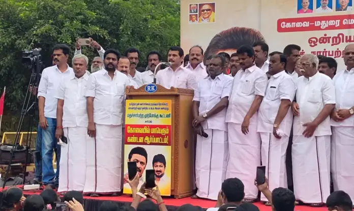 கோவை–மதுரை மெட்ரோ திட்ட நிராகரிப்பை கண்டித்து கோவையில் முன்னாள் அமைச்சர் செந்தில்பாலாஜி தலைமையில் ஆர்ப்பாட்டம் நடைபெற்றது.