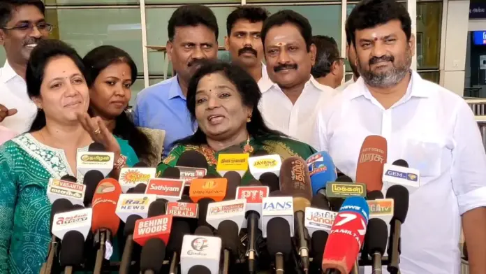 No ReEntry For DMK என்று தெளிவாக கூற முடியும் என தெரிவித்தார். நிதித்துறை அமைச்சர் நிர்மலா சீதாராமன் பிரதமர் மோடியின் வழிகாட்டுதலின்படி ஜிஎஸ்டி என்ற பொருளாதாரப் புரட்சியை ஏற்படுத்தி உள்ளதாகவும் அதற்கு ஒரே இடத்தில் ஆவது நன்றி கூறினீர்களா என கேள்வி எழுப்பினார். யார் எதிர்த்தாலும் நாங்கள் தான் ஜெயிப்போம் என்று செந்தில் பாலாஜி கூறுகிறார் அதற்கு 200 என்பதை குறிப்பிடுகிறார் என்பதை சுட்டிக்காட்டிய தமிழிசை சௌந்தரராஜன் உங்களுக்கு 200 300 400 என்பது பழக்கமான ஒன்றுதான் என்று தெரிவித்த அவர் அதனால் தான் நீங்கள் தோற்கவும் போகிறீர்கள் எனக் கூறினார்.