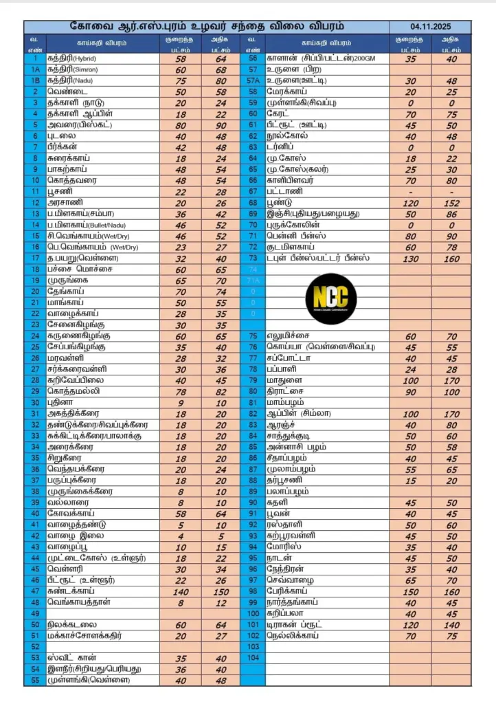 உழவர் சந்தை விலை அடிப்படையில் இன்றைய காய்கறிகள் பழங்கள் விலைப் பட்டியல் தொகுக்கப்பட்டுள்ளது.