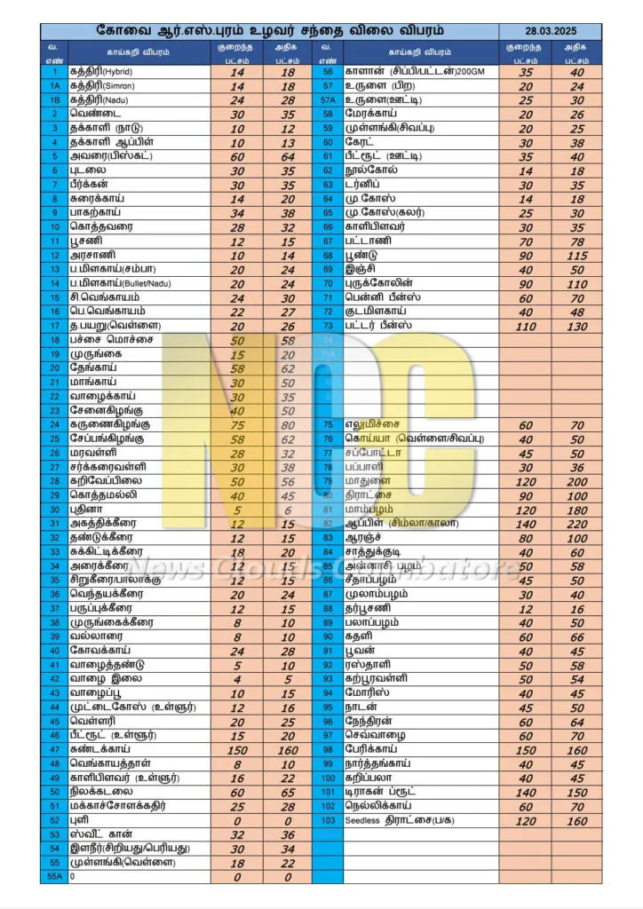 கோவை மாவட்டத்தில் காய்கறிகள் & பழங்களின் இன்றைய (மார்ச் 18ம் தேதி) விலை நிலவரம் உழவர் சந்தை நிர்ணயித்த விலை அடிப்படையில் கீழே தொகுக்கப்பட்டுள்ளது.