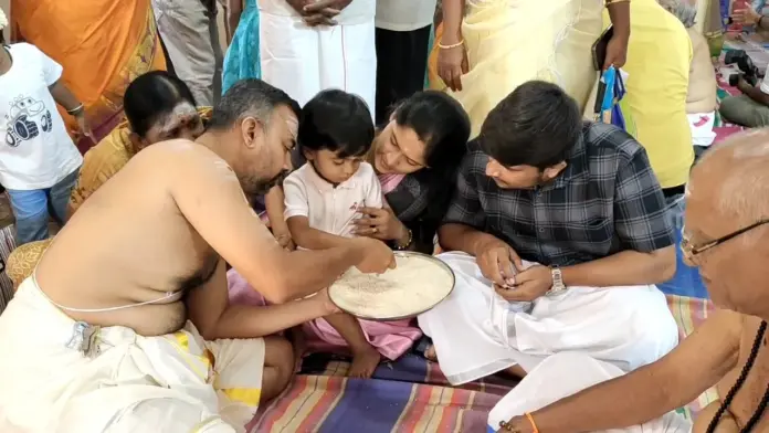தொடர்ந்து நம்பூதிரிகள் குழந்தைகளின் நாக்கில் குழந்தைகளின் பெயர்களை எழுதினர். பின்னர் குழந்தைகளின் விரலைப் பிடித்து அரிசியில் தாய்மொழியின் முதல் எழுத்து, குழந்தைகளின் பெயர், பிள்ளையார் சுழி, அம்மா,அப்பா என்று எழுத வைத்தனர்.