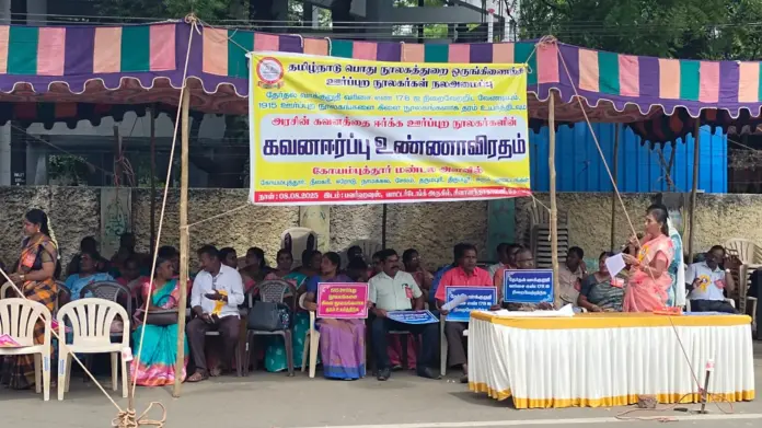 கோவையில் கோயம்புத்தூர் மண்டலத்தை சேர்ந்த ஊர்ப்புற நூலகர்கள் ஊர்ப்புற நூலகங்களை தரம் உயர்த்திட வலியுறுத்தியும் காலமுறை ஊதியம் தர வலியுறுத்தியும் கவனயீர்ப்பு உண்ணாவிரத போராட்டத்தில் ஈடுபட்டுள்ளனர்.