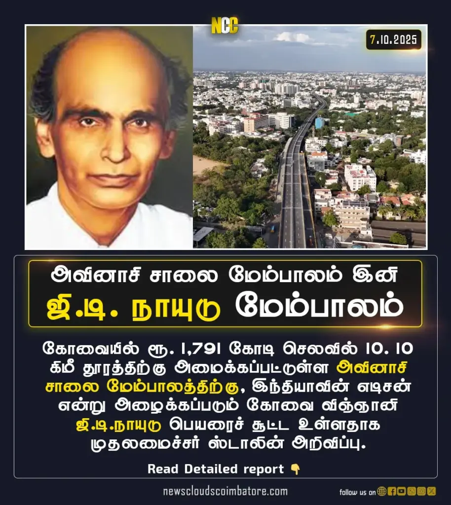 இதனிடையே அவினாசி சாலை மேம்பாலத்திற்குக் கோவையைச் சேர்ந்த விஞ்ஞானி ஜிடி நாயுடு பெயரைச் சூட்டுவதாக முதலமைச்சர் அறிவித்துள்ளார்.